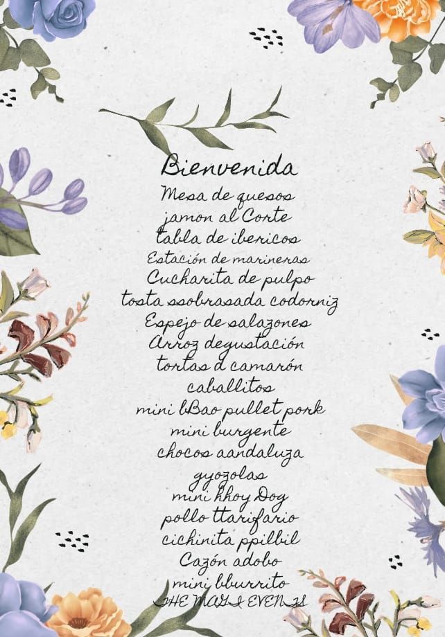 Mesa de Quesos | Jamón al Corte | Tabla de Ibéricos | Estación de Marineras | Cucharita de Pulpo | Tosta Sobrasada y Codorniz | Espejo de Salazones | Arroz Degustación | Tortitas de Camarón | Caballitos | Mini Bao Pulled Pork | Mini Burguer | Chocos a la Andaluza | Gyozas | Mini Khot Dog | Pollo Tarifiario | Cochinita Pibil | Cazón Adobo | Mini Burrito