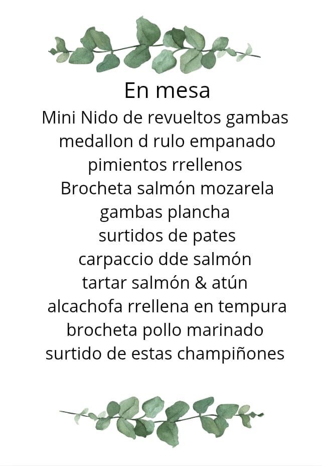 Nuestra propuesta gastronómica es flexible y personalizable. Contamos con menús orientativos que sirven como base, pero siempre adaptados a las preferencias del cliente, al tipo de evento y a la temporada.